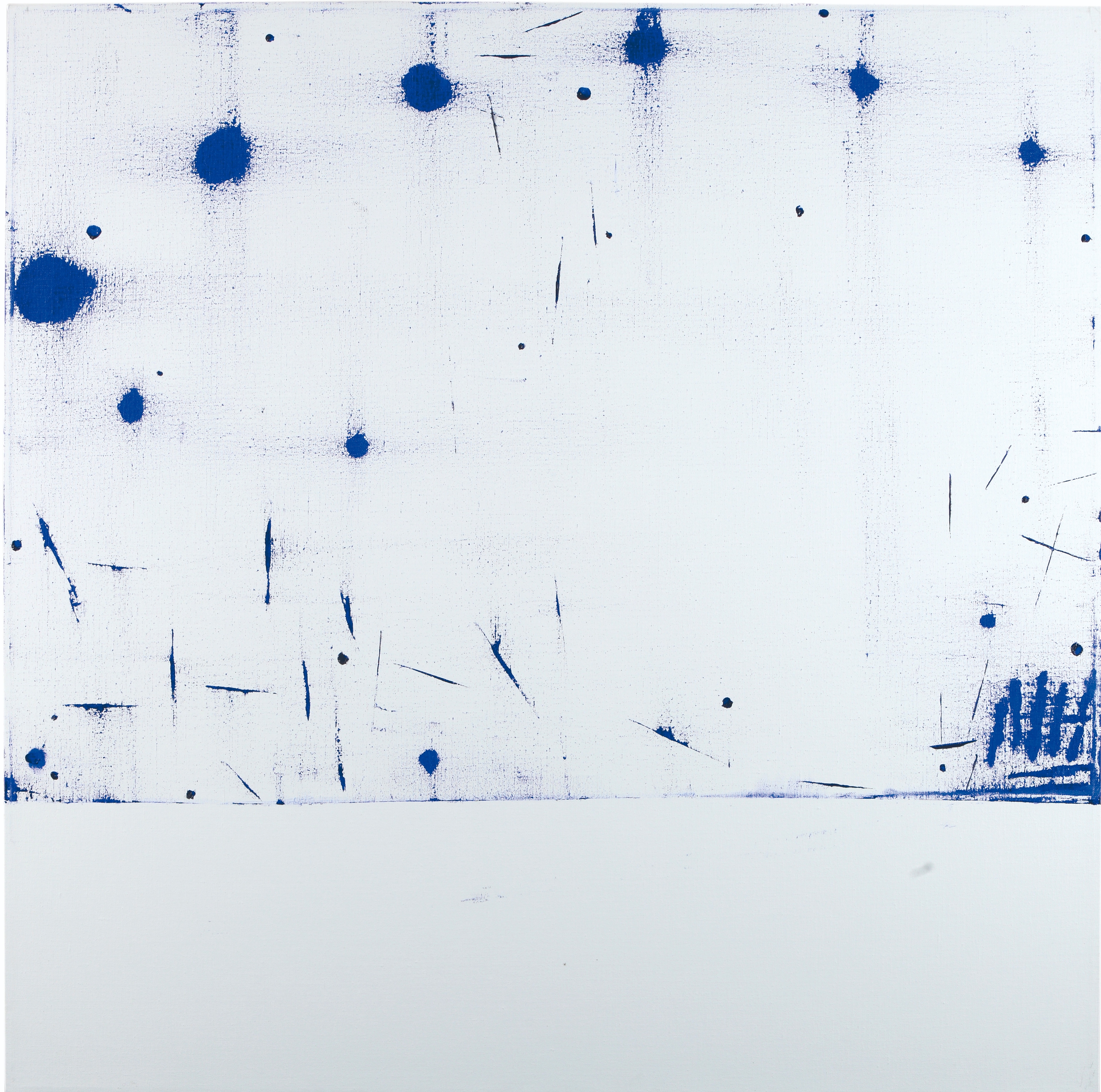 在此系列近三十幅的紙上作品裡,江賢二用單一色彩,以各式的工具, 或以手擦、或磨、或刮地在紙上留下傷痕般的印記,乍看靜謐的藍色畫面,其實是令人觸目驚心的線條、充滿線條節奏的張力,彷彿《流浪者之歌》中激昂壯烈又不時轉為幽微低吟的琴音,就是江賢二作畫時起起伏伏的心情。